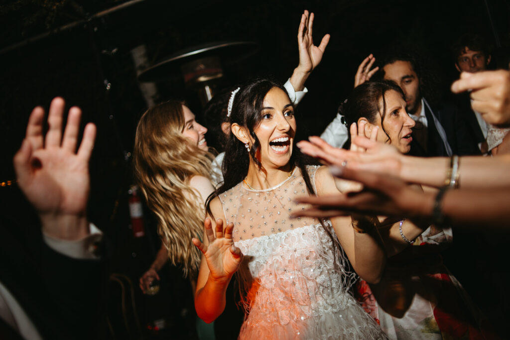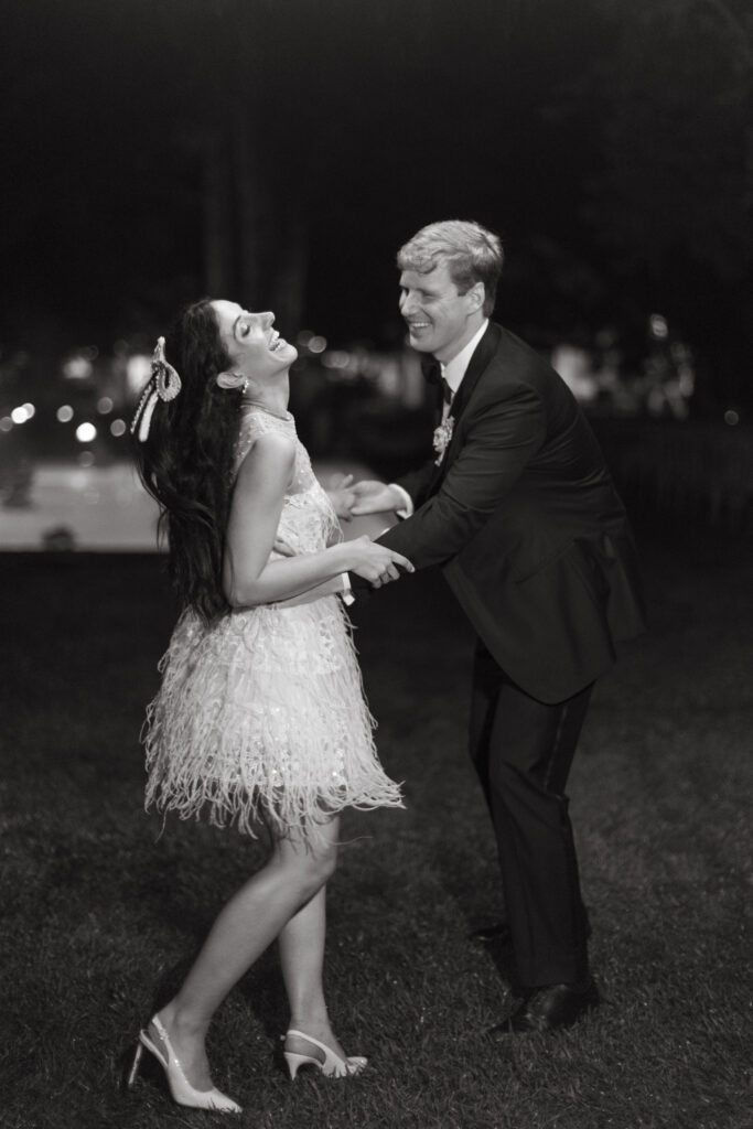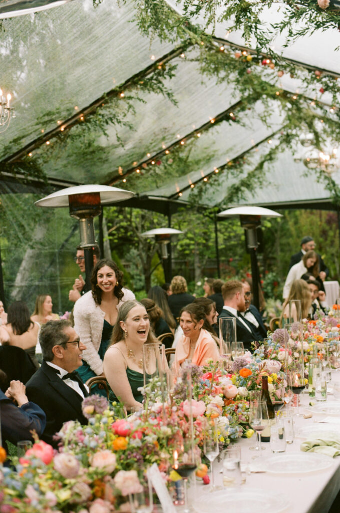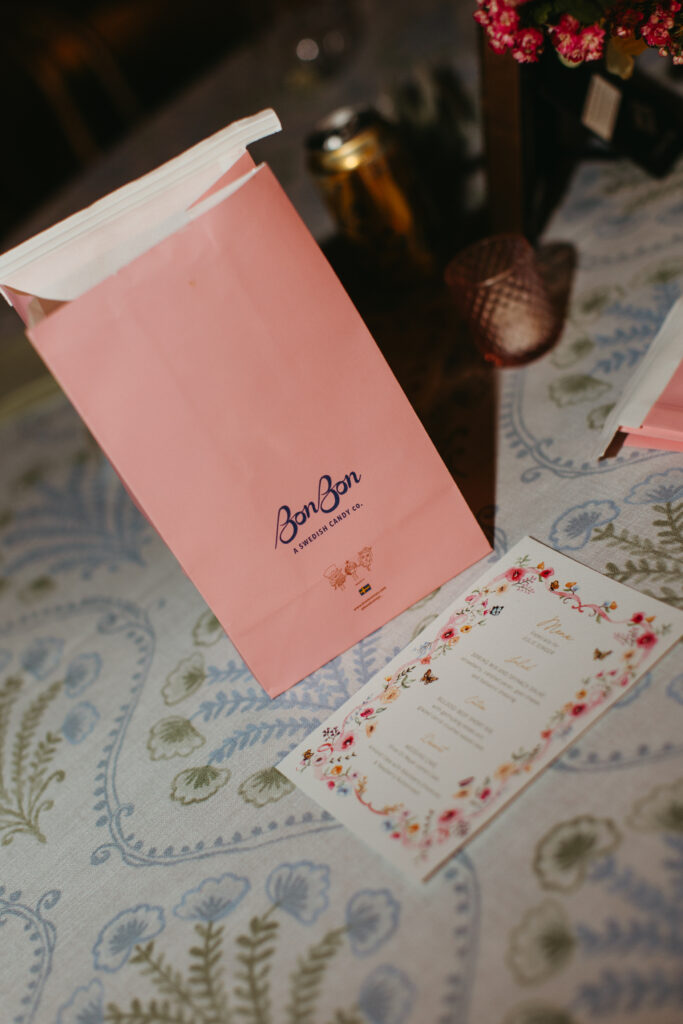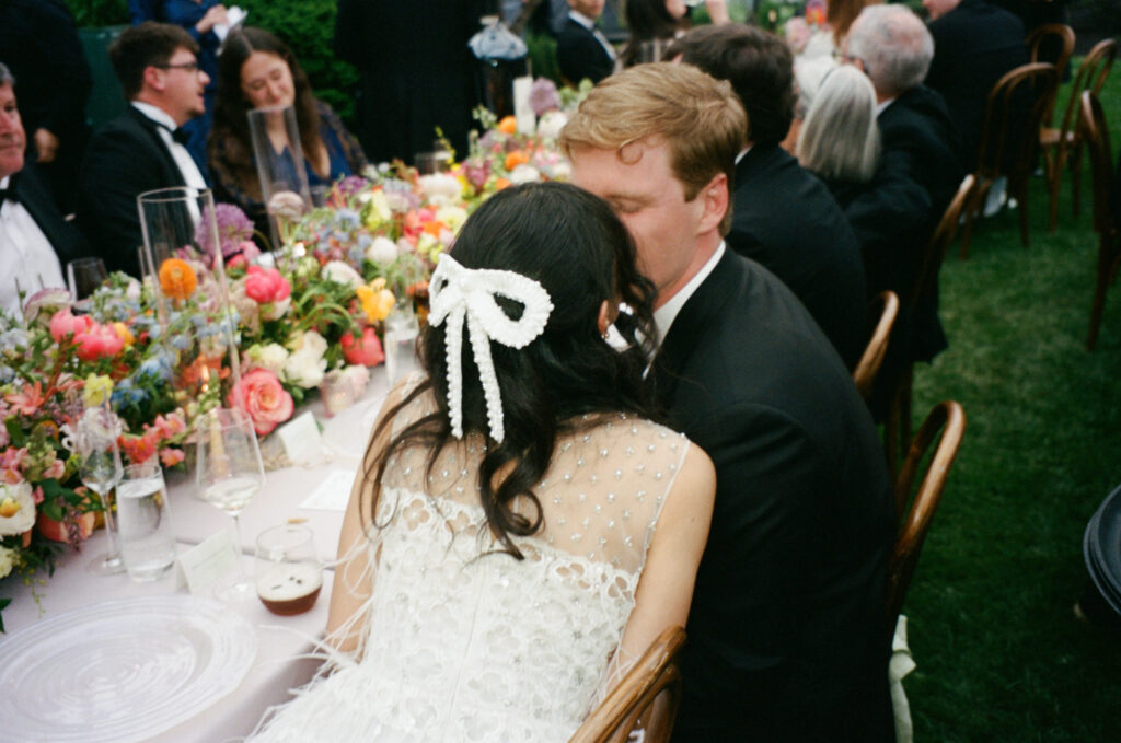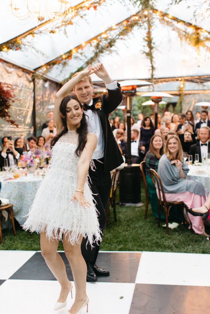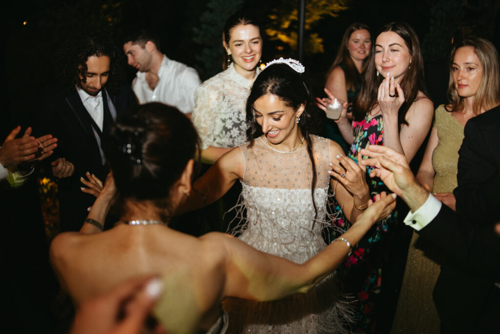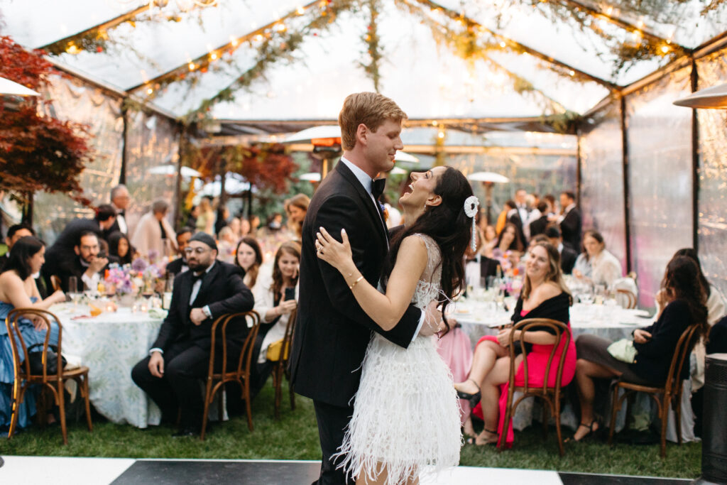 The reception took place under a beautifully tented space that transformed the backyard into a world of its own. The ceiling was covered in cascading greenery, sparkling chandeliers, and shimmering disco balls that caught the light from every angle. It was maximalist, magical, and full of personality. Guests were treated to a candy bar full of the couple’s New York favorites – a sweet nod to the city they call home.
