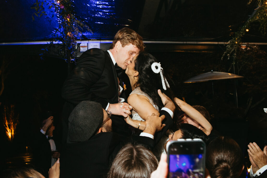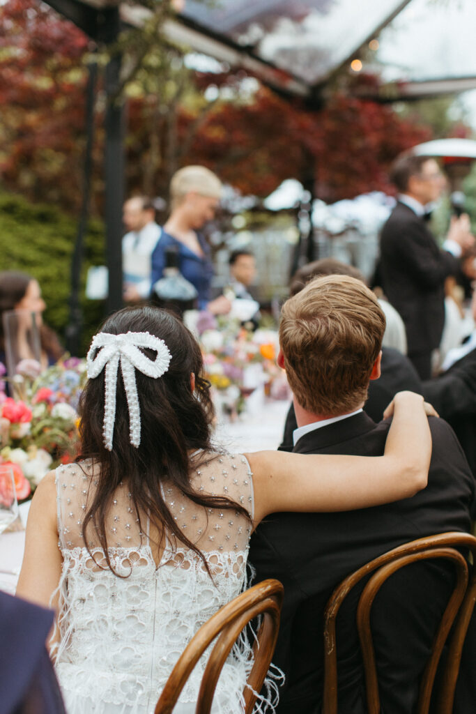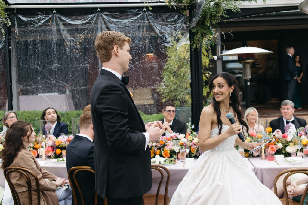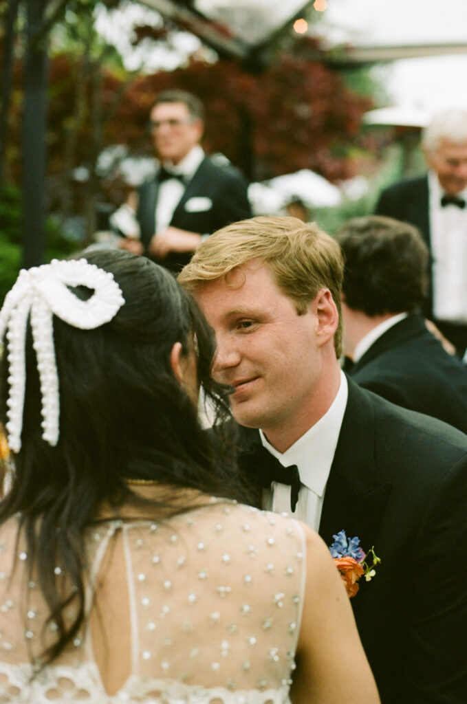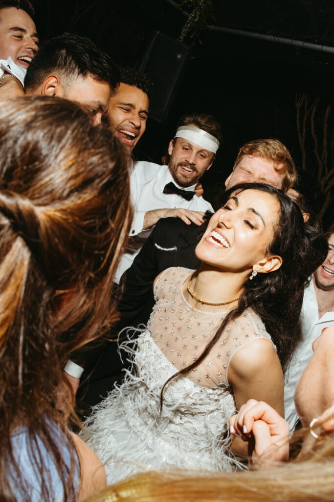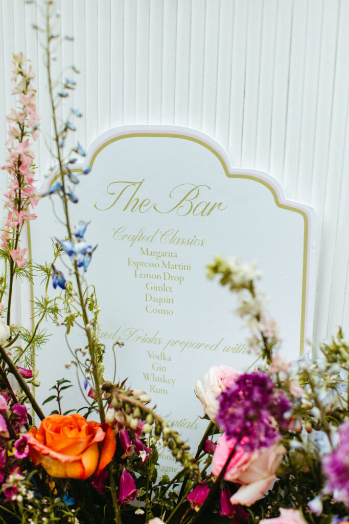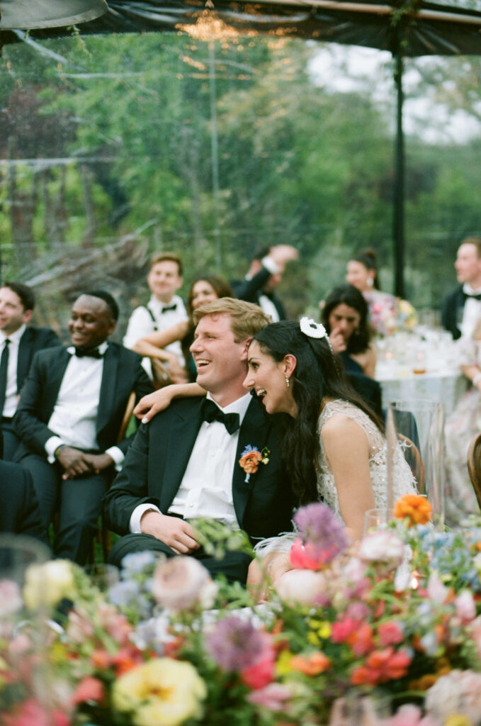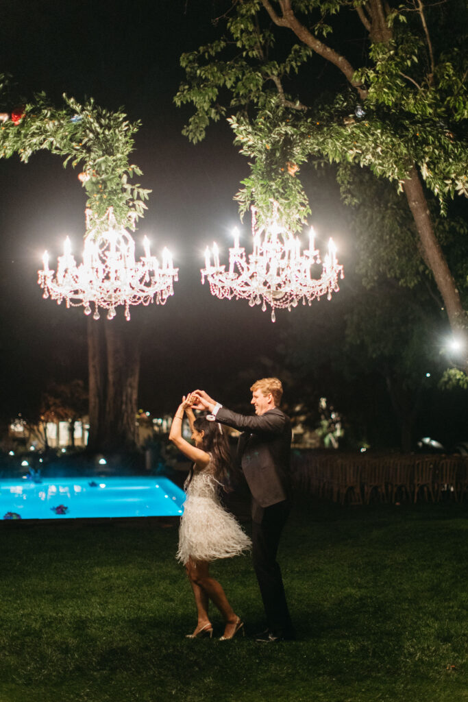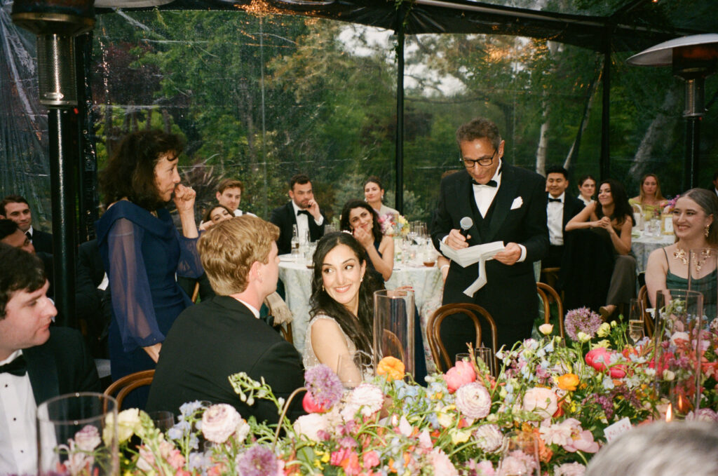 The reception took place under a beautifully tented space that transformed the backyard into a world of its own. The ceiling was covered in cascading greenery, sparkling chandeliers, and shimmering disco balls that caught the light from every angle. It was maximalist, magical, and full of personality. Guests were treated to a candy bar full of the couple’s New York favorites – a sweet nod to the city they call home.