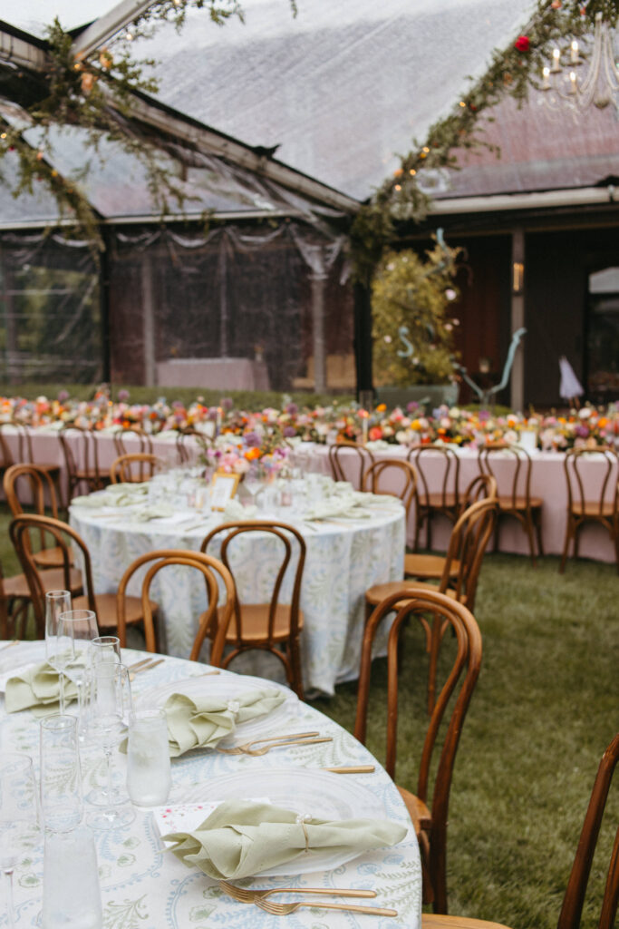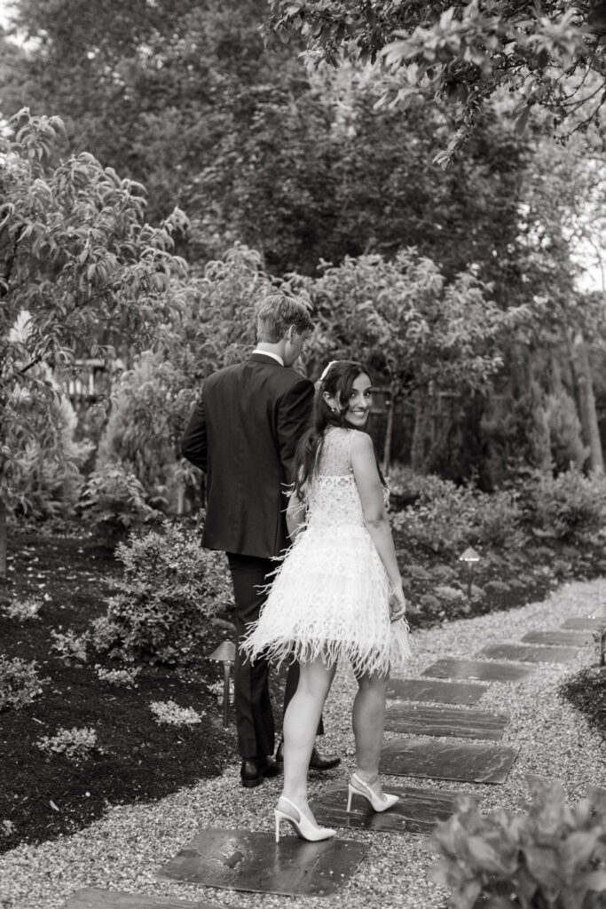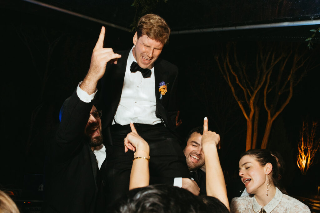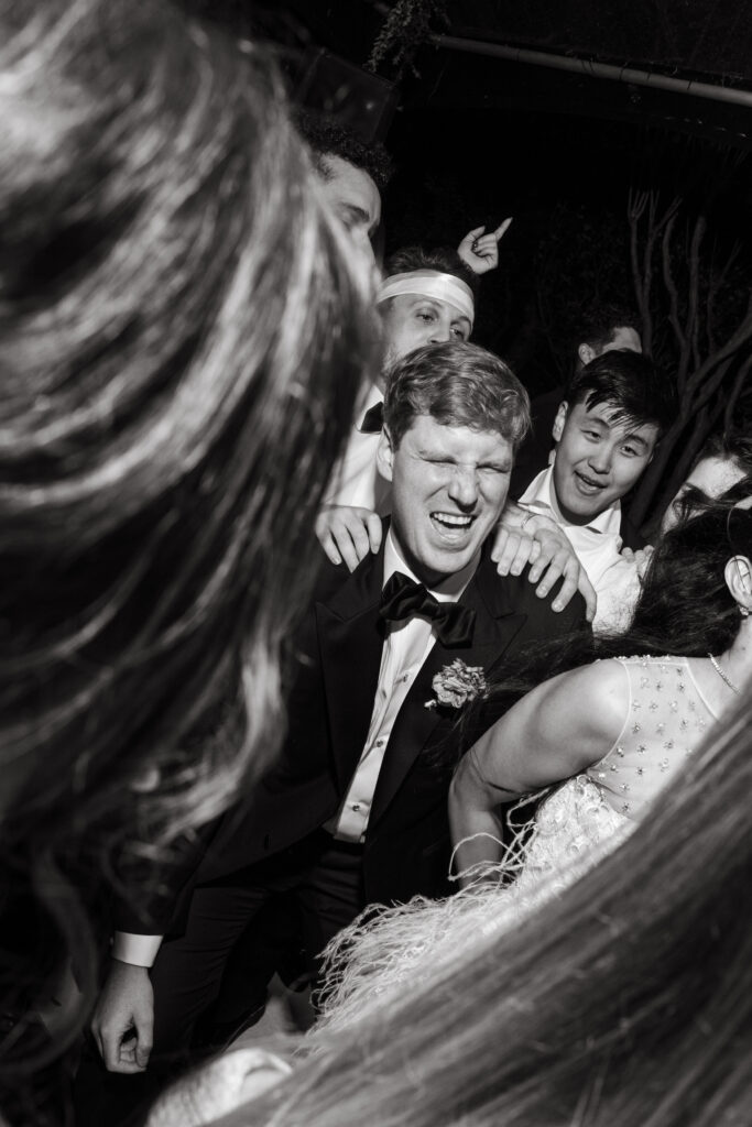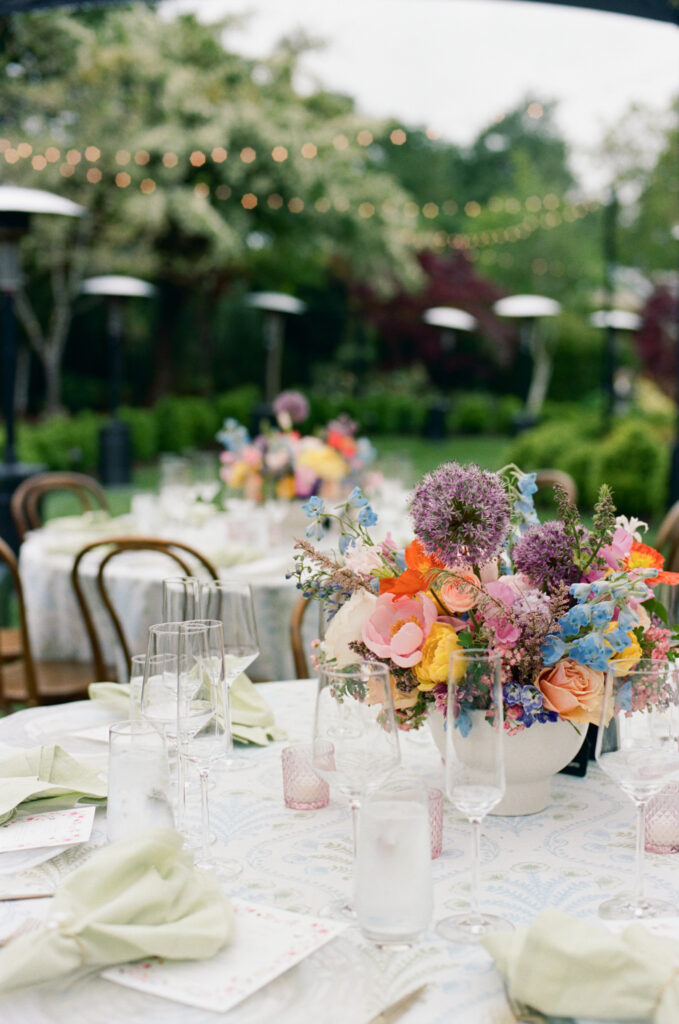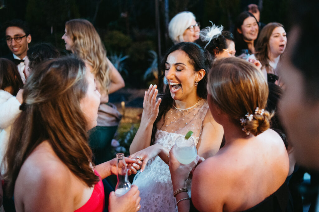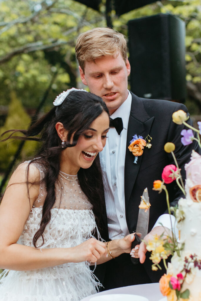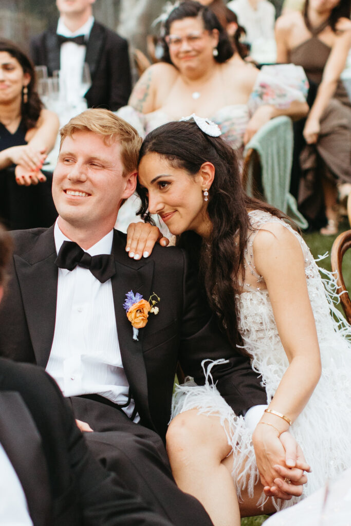 The reception took place under a beautifully tented space that transformed the backyard into a world of its own. The ceiling was covered in cascading greenery, sparkling chandeliers, and shimmering disco balls that caught the light from every angle. It was maximalist, magical, and full of personality. Guests were treated to a candy bar full of the couple’s New York favorites – a sweet nod to the city they call home.