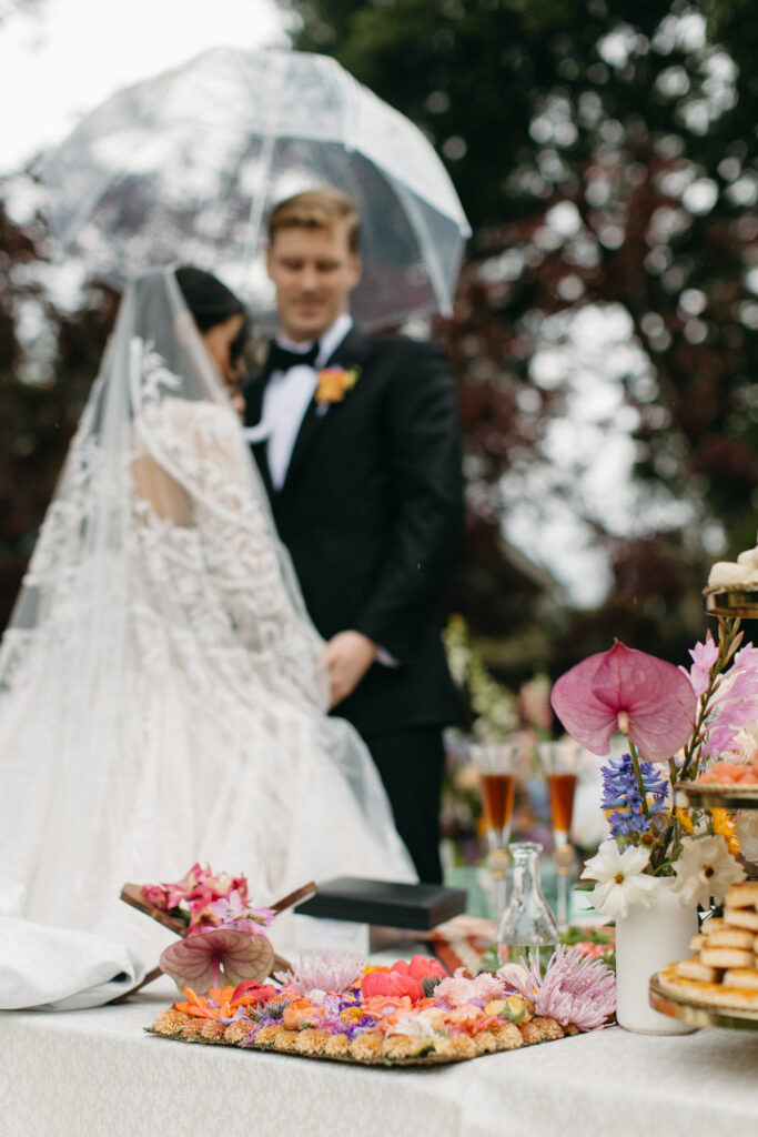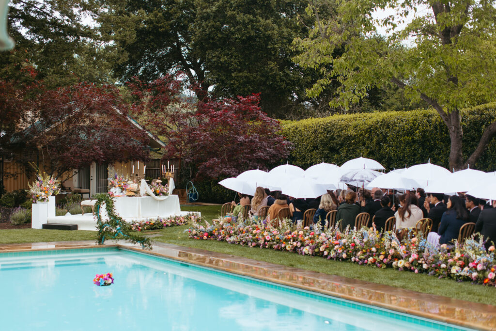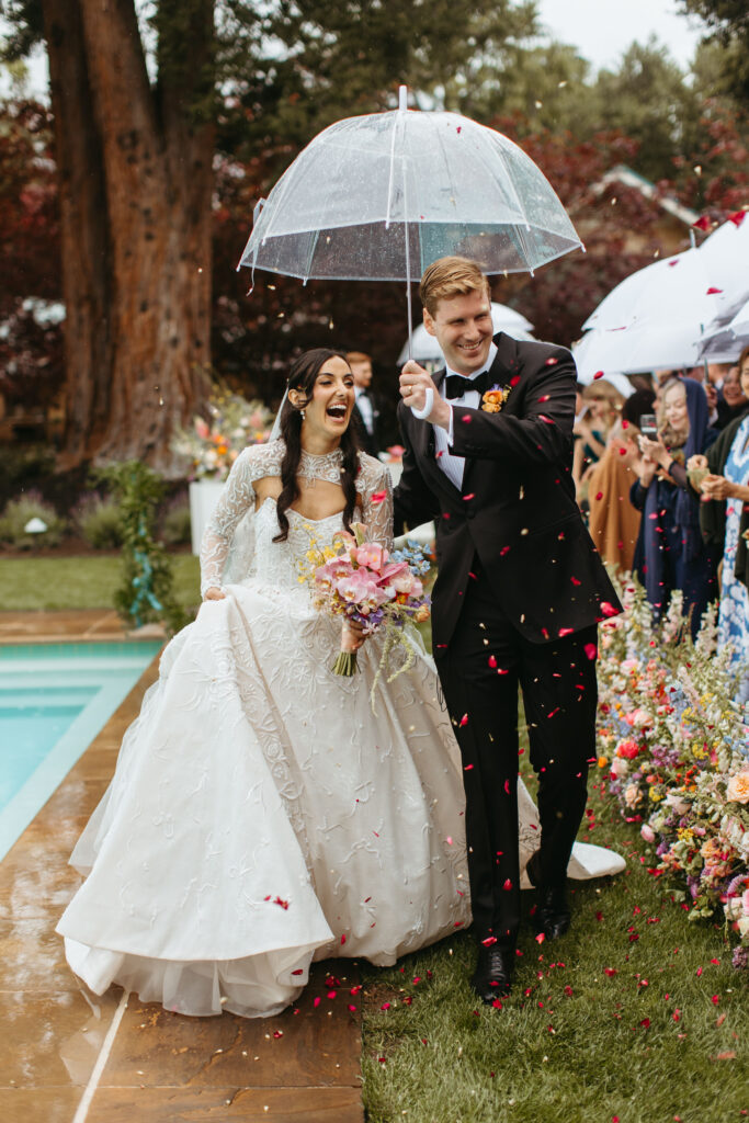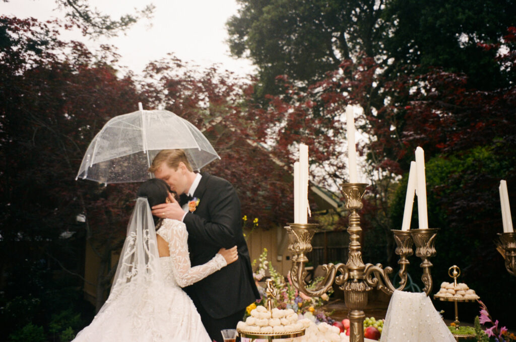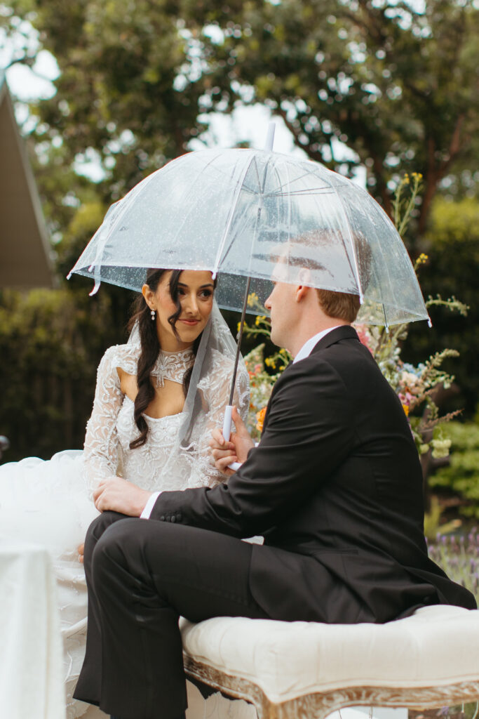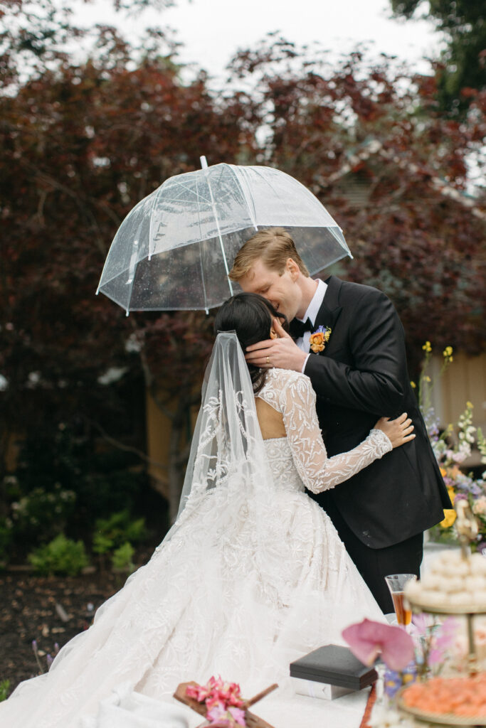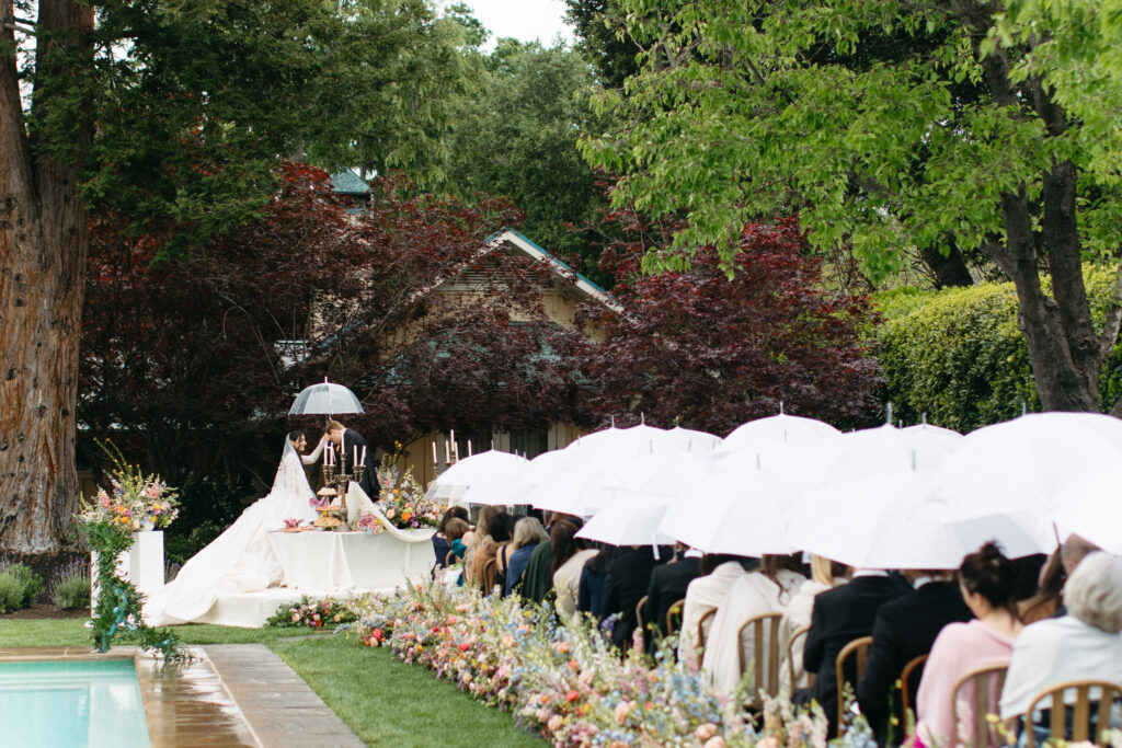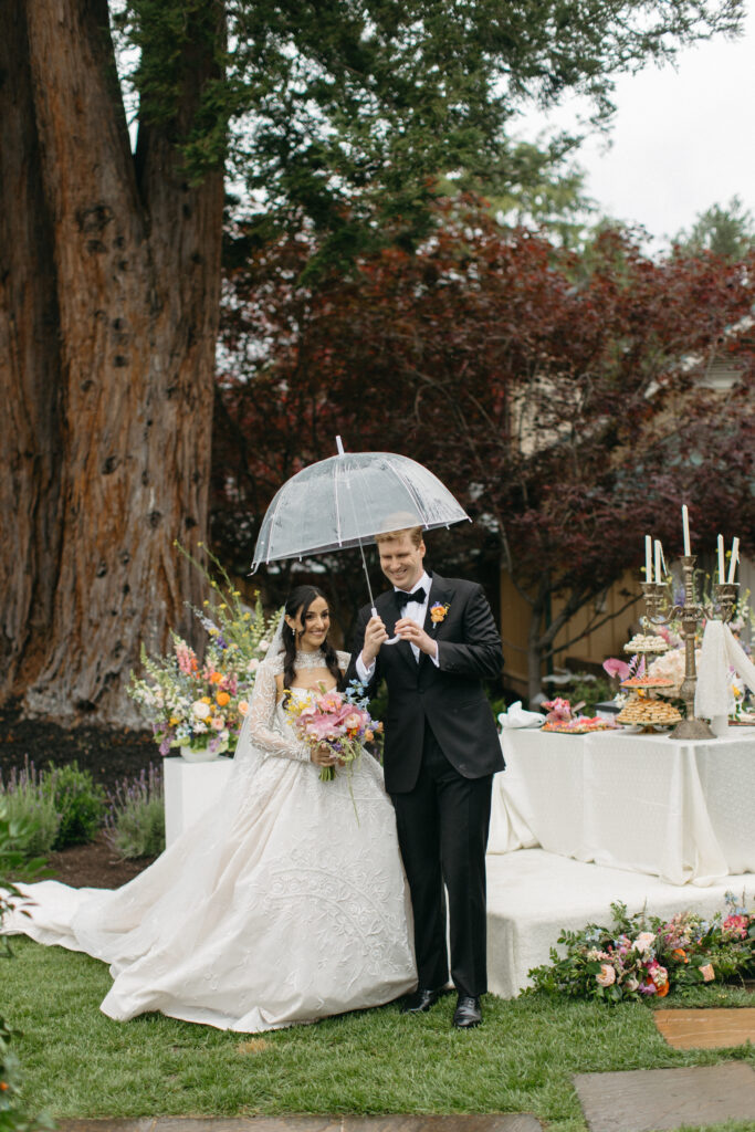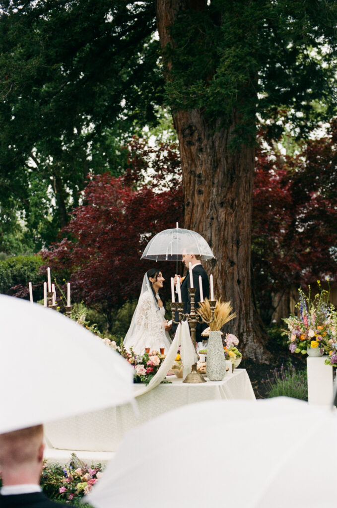 The ceremony beautifully merged Persian and Western traditions. A stunning sofreh took center stage, filled with symbolic elements, heirlooms, and personal touches – paired with a few Western nods that made the moment feel uniquely theirs. And in true Sonoma fashion, the weather made an appearance: a soft, misty rain settled in right as the ceremony began. Guests gathered under umbrellas, creating a romantic, moody scene that felt straight out of a movie.