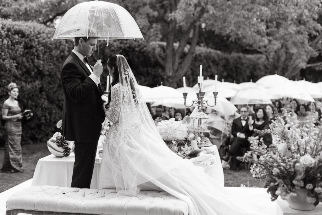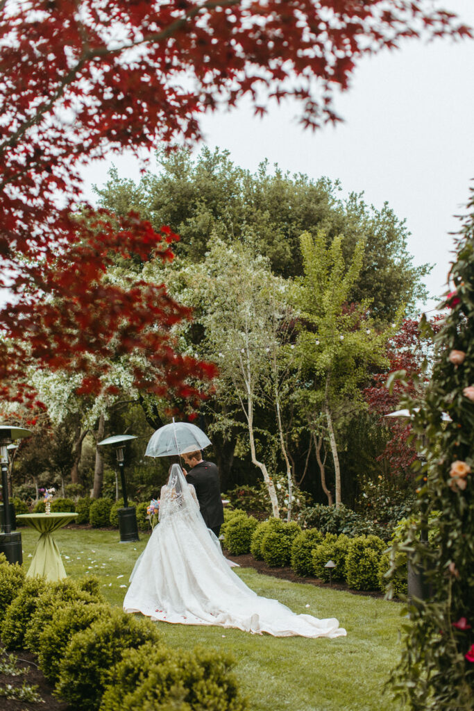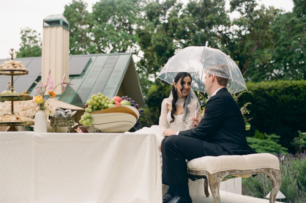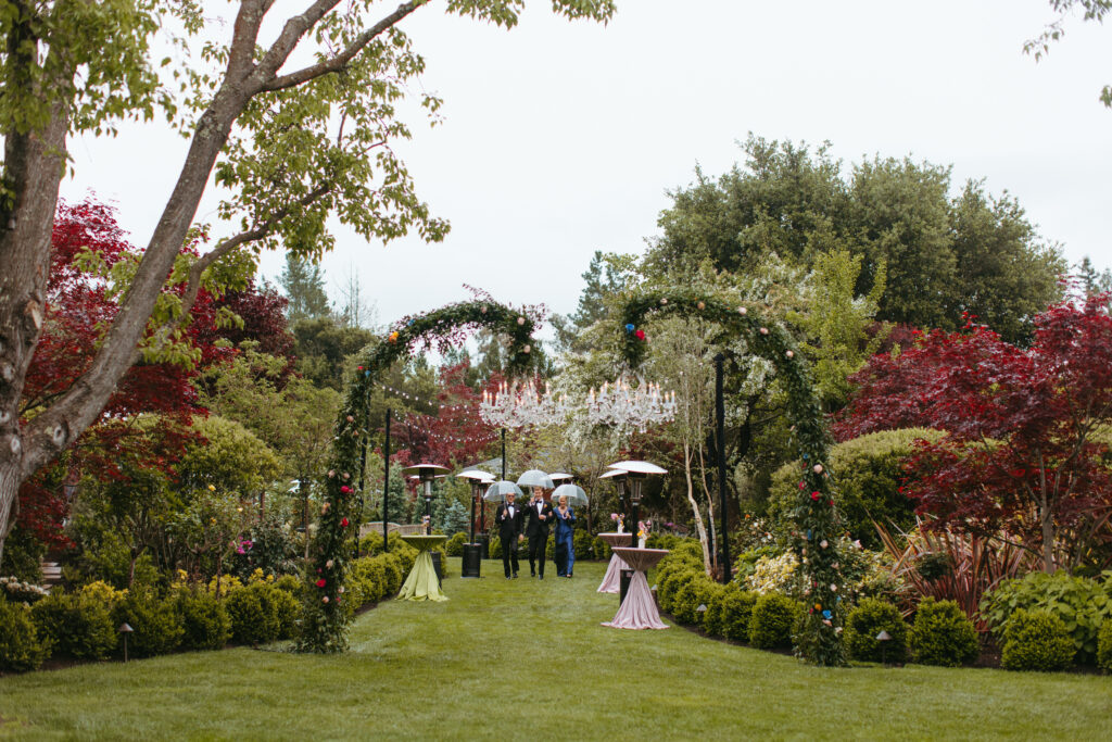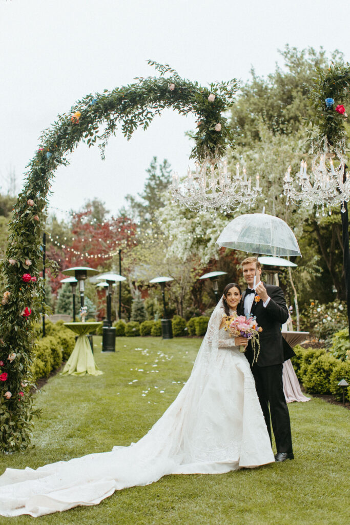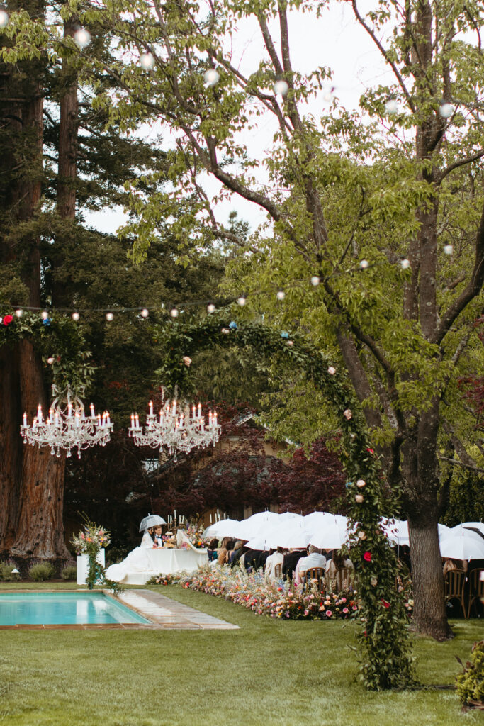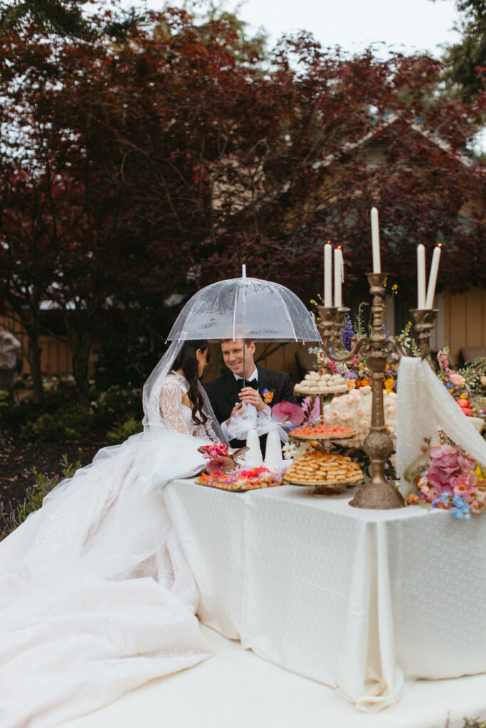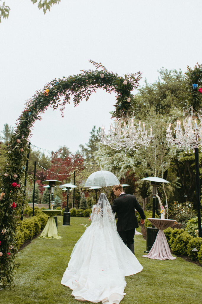 The ceremony beautifully merged Persian and Western traditions. A stunning sofreh took center stage, filled with symbolic elements, heirlooms, and personal touches – paired with a few Western nods that made the moment feel uniquely theirs. And in true Sonoma fashion, the weather made an appearance: a soft, misty rain settled in right as the ceremony began. Guests gathered under umbrellas, creating a romantic, moody scene that felt straight out of a movie.