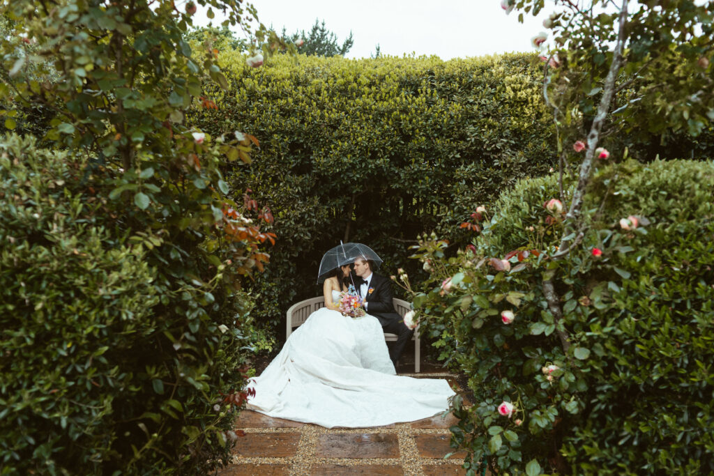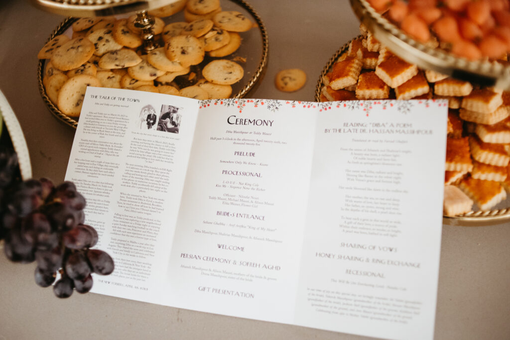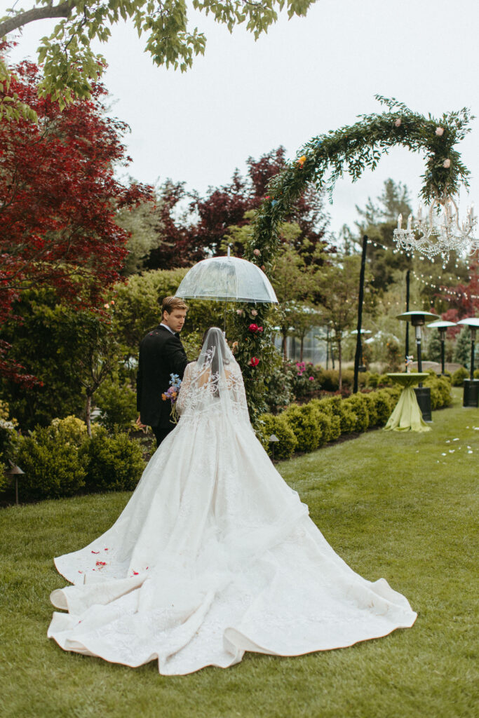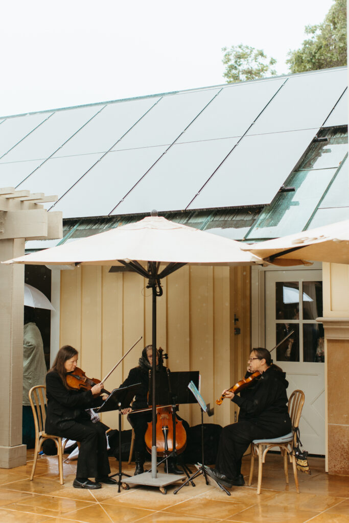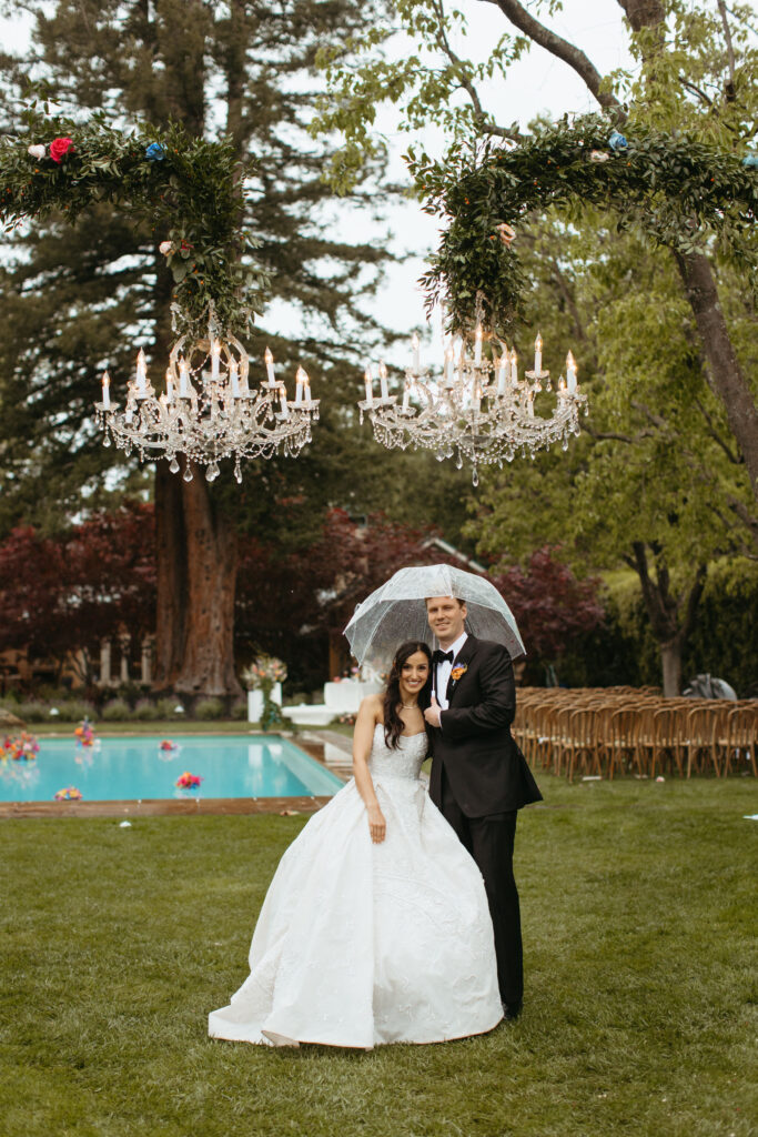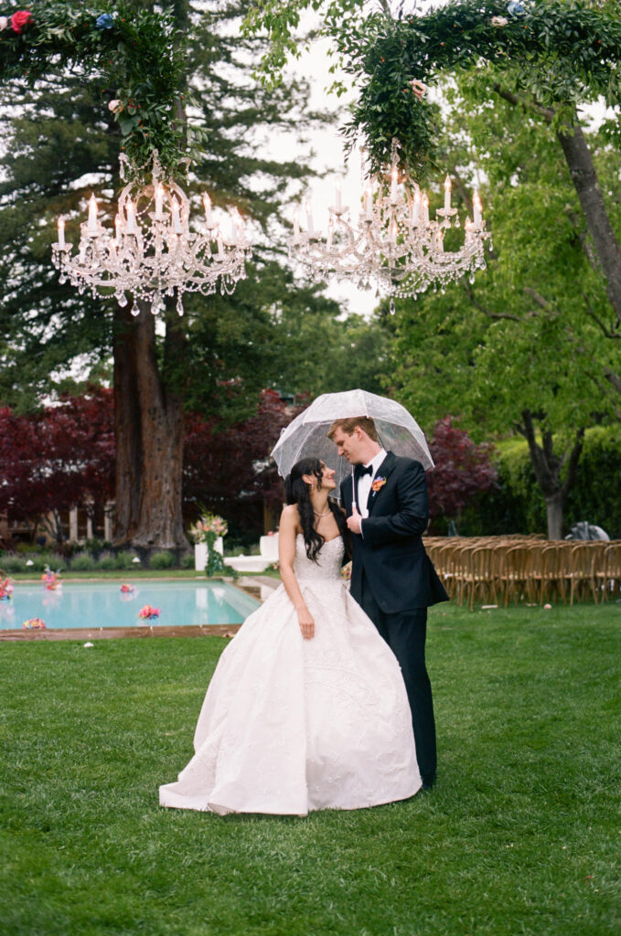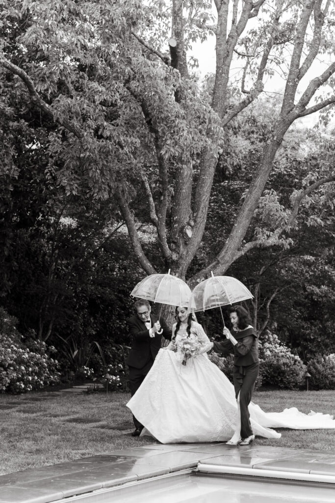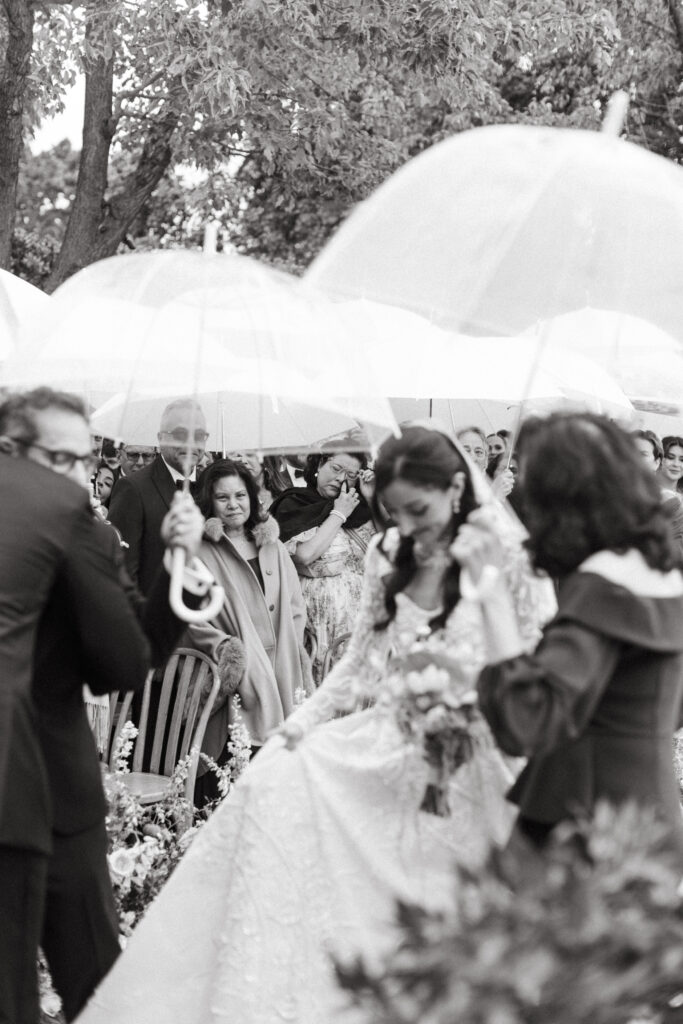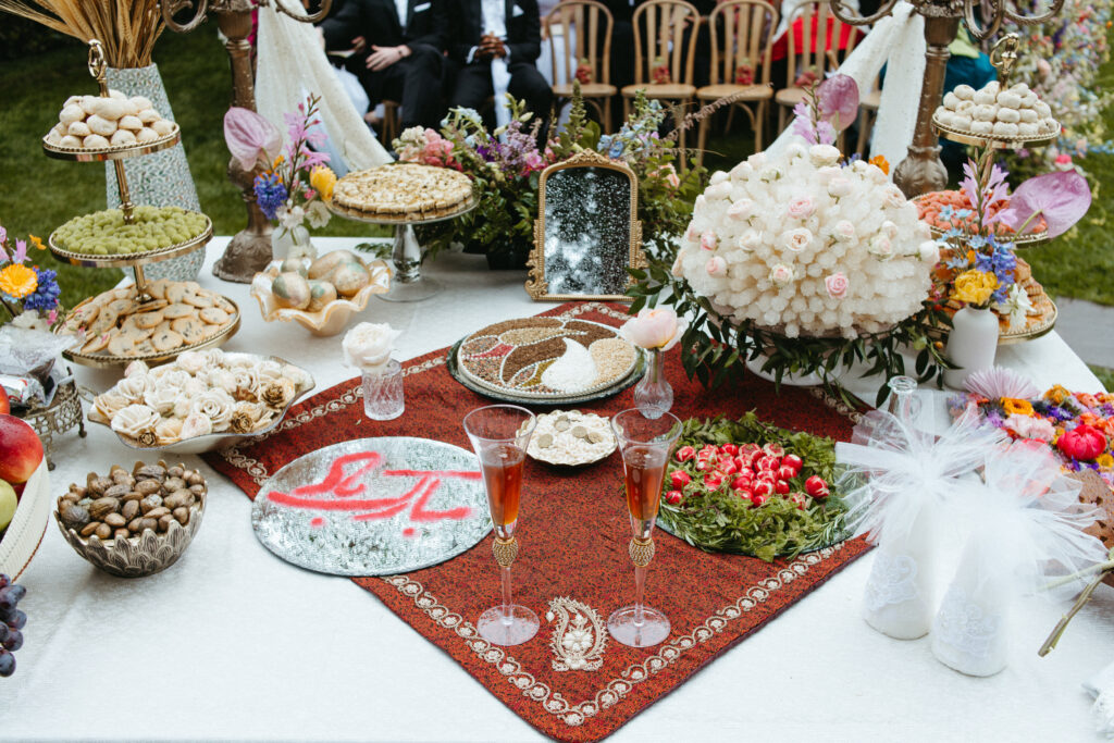 The ceremony beautifully merged Persian and Western traditions. A stunning sofreh took center stage, filled with symbolic elements, heirlooms, and personal touches – paired with a few Western nods that made the moment feel uniquely theirs. And in true Sonoma fashion, the weather made an appearance: a soft, misty rain settled in right as the ceremony began. Guests gathered under umbrellas, creating a romantic, moody scene that felt straight out of a movie.