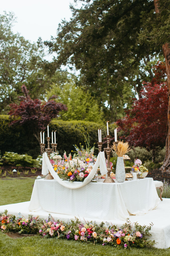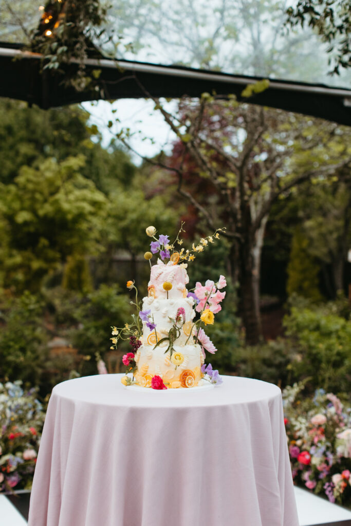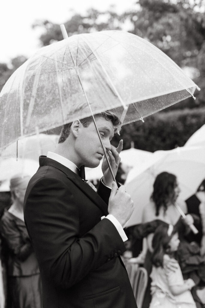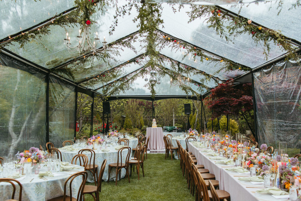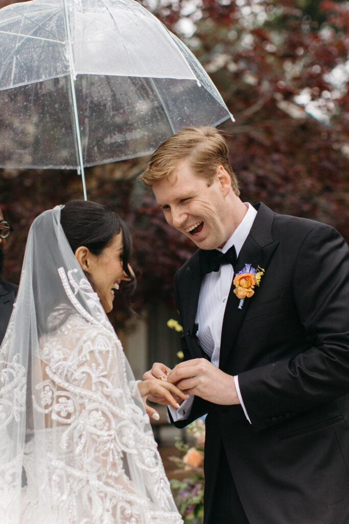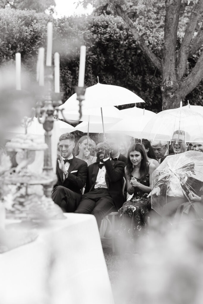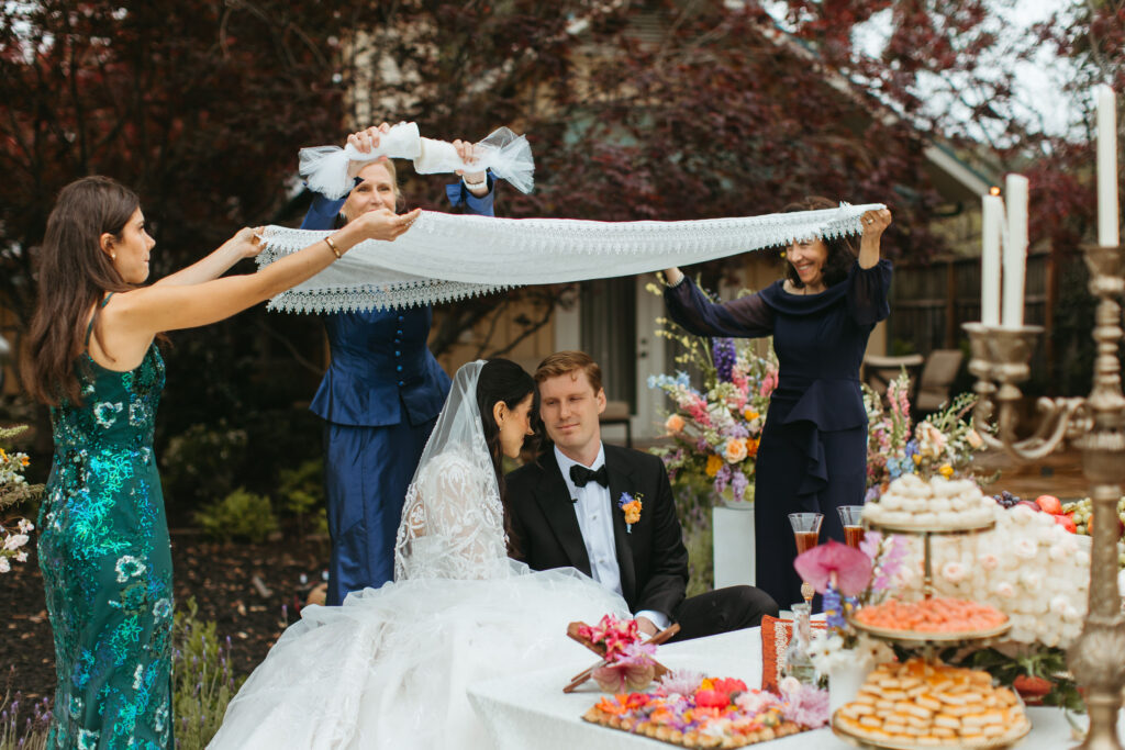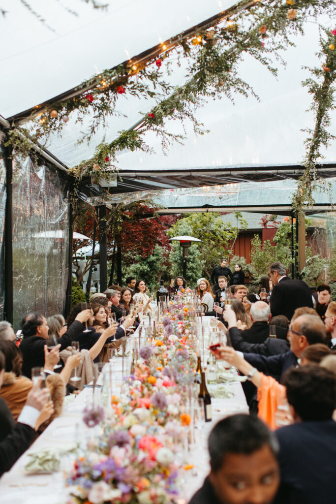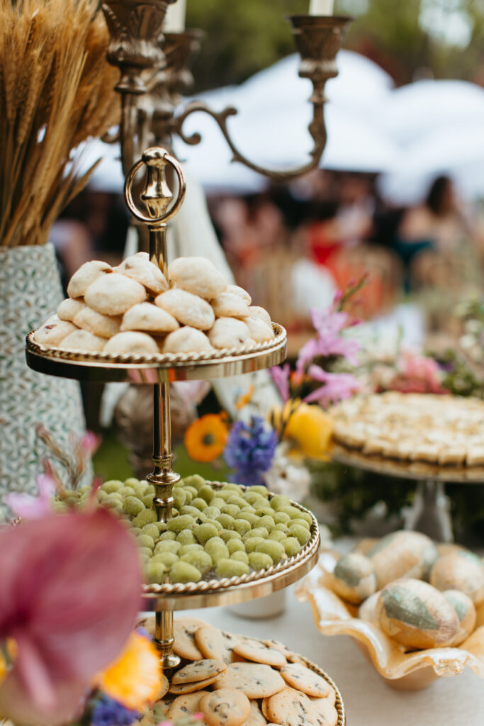 The ceremony beautifully merged Persian and Western traditions. A stunning sofreh took center stage, filled with symbolic elements, heirlooms, and personal touches – paired with a few Western nods that made the moment feel uniquely theirs. And in true Sonoma fashion, the weather made an appearance: a soft, misty rain settled in right as the ceremony began. Guests gathered under umbrellas, creating a romantic, moody scene that felt straight out of a movie.