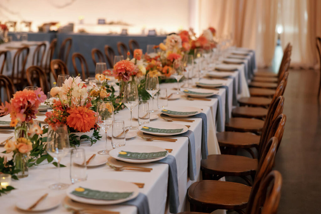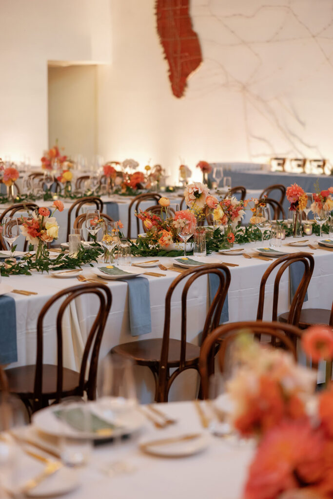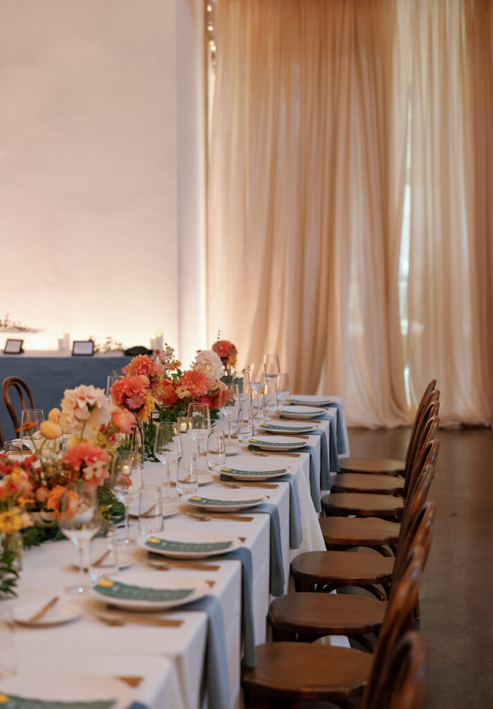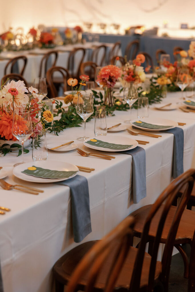 The color palette leaned into rich blues and greens, layered with florals that felt like a San Francisco sunset exploding across the room – warm corals, golden tones, and vibrant pops woven throughout. It was bold, energetic, and impossible to ignore.