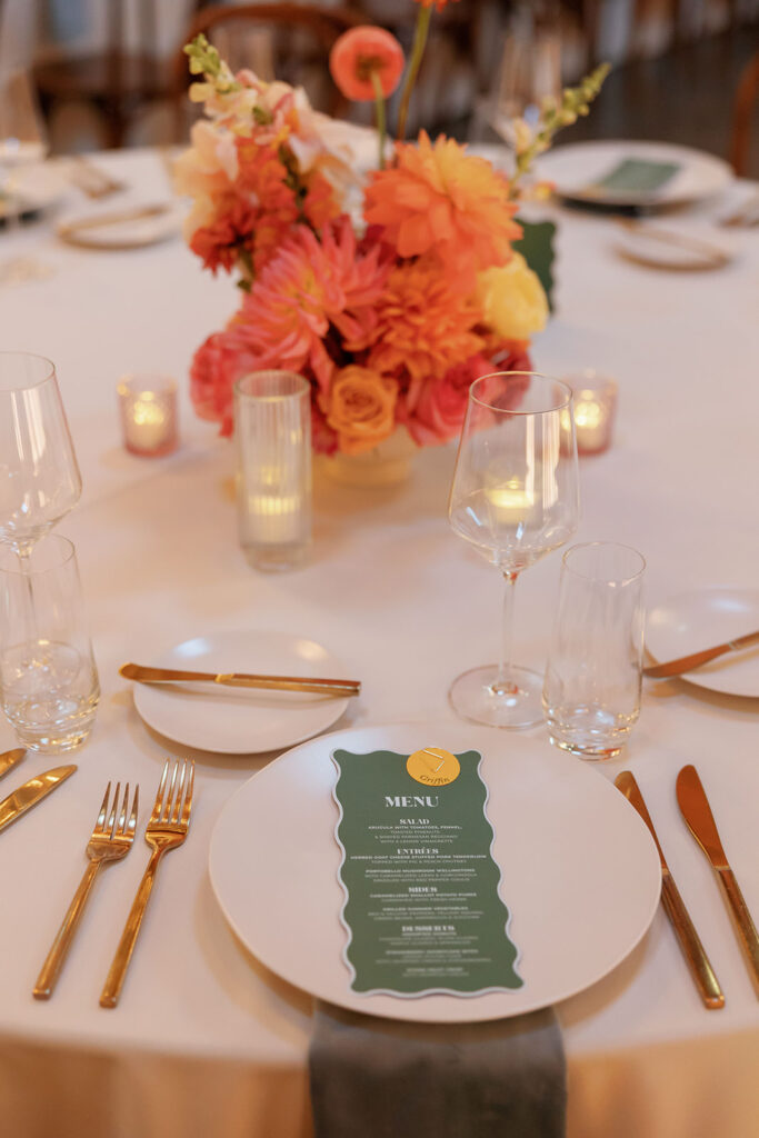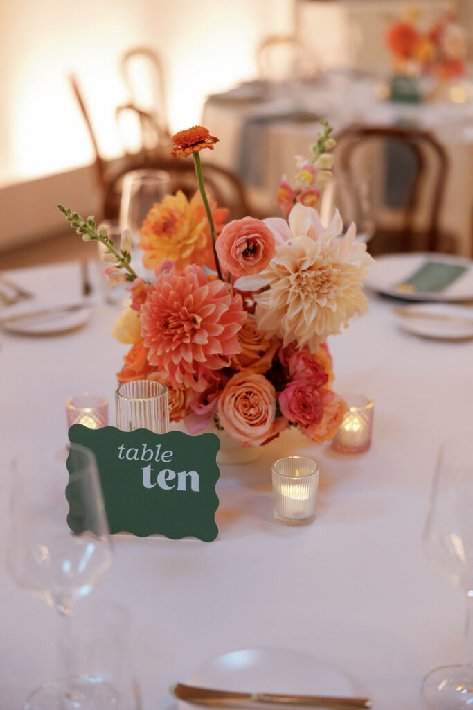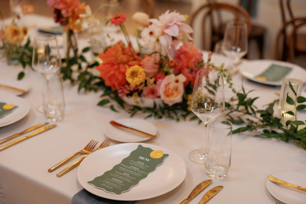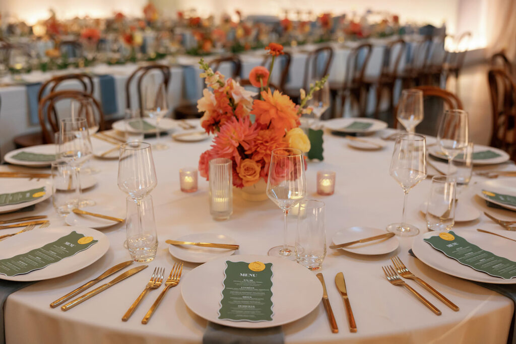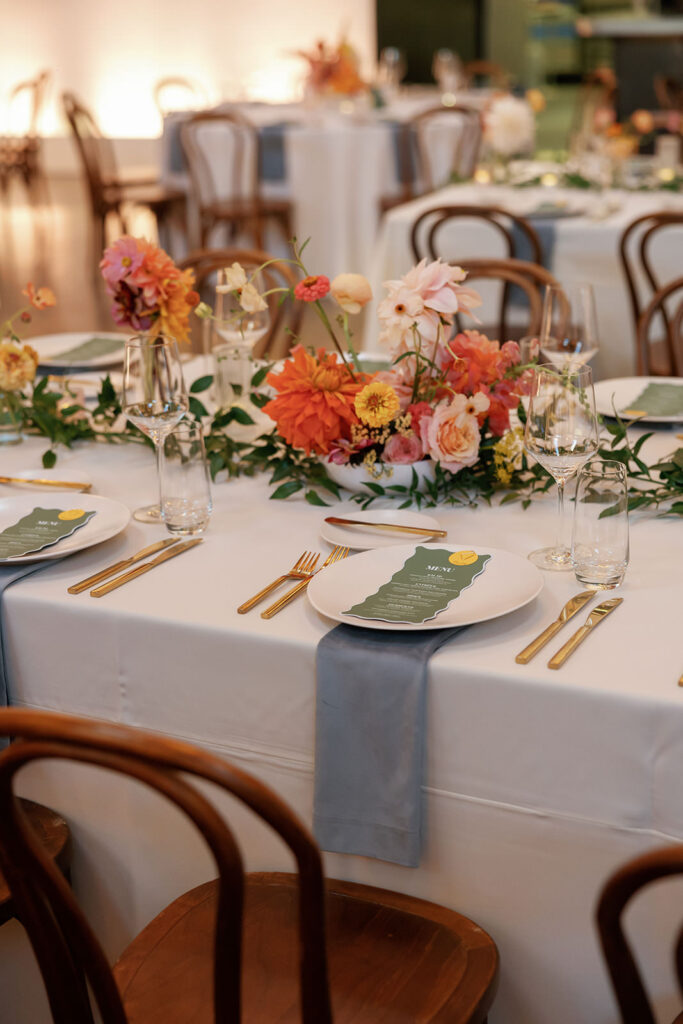 The color palette leaned into rich blues and greens, layered with florals that felt like a San Francisco sunset exploding across the room – warm corals, golden tones, and vibrant pops woven throughout. It was bold, energetic, and impossible to ignore.